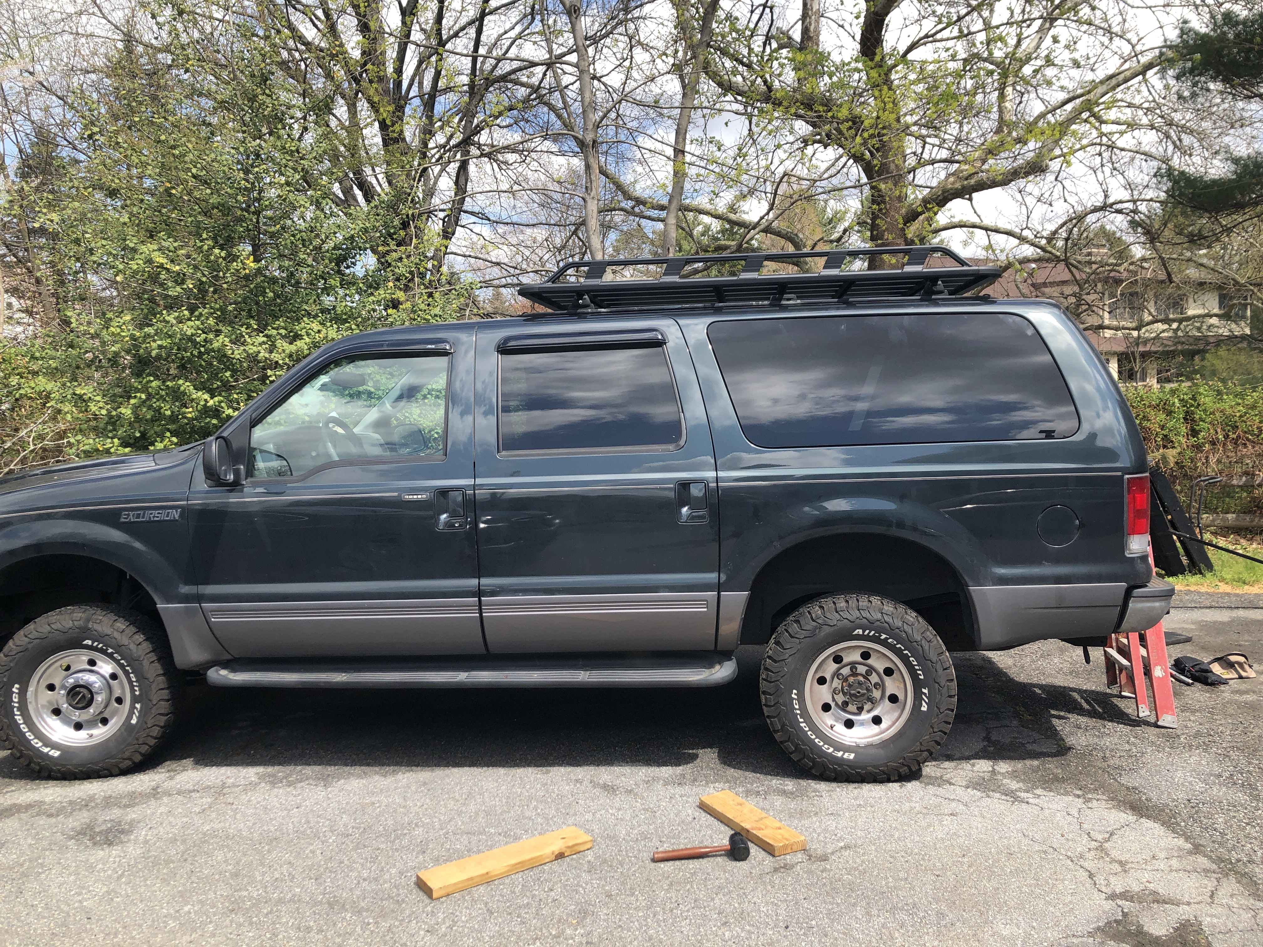 The factory roof rack on the Excursion is a joke. In order to keep the car garagable, the crossbars basically sit flat on the roof. Those crossbars flex under any sort of a load, so when you put anything on the roof, you’re denting the roof.