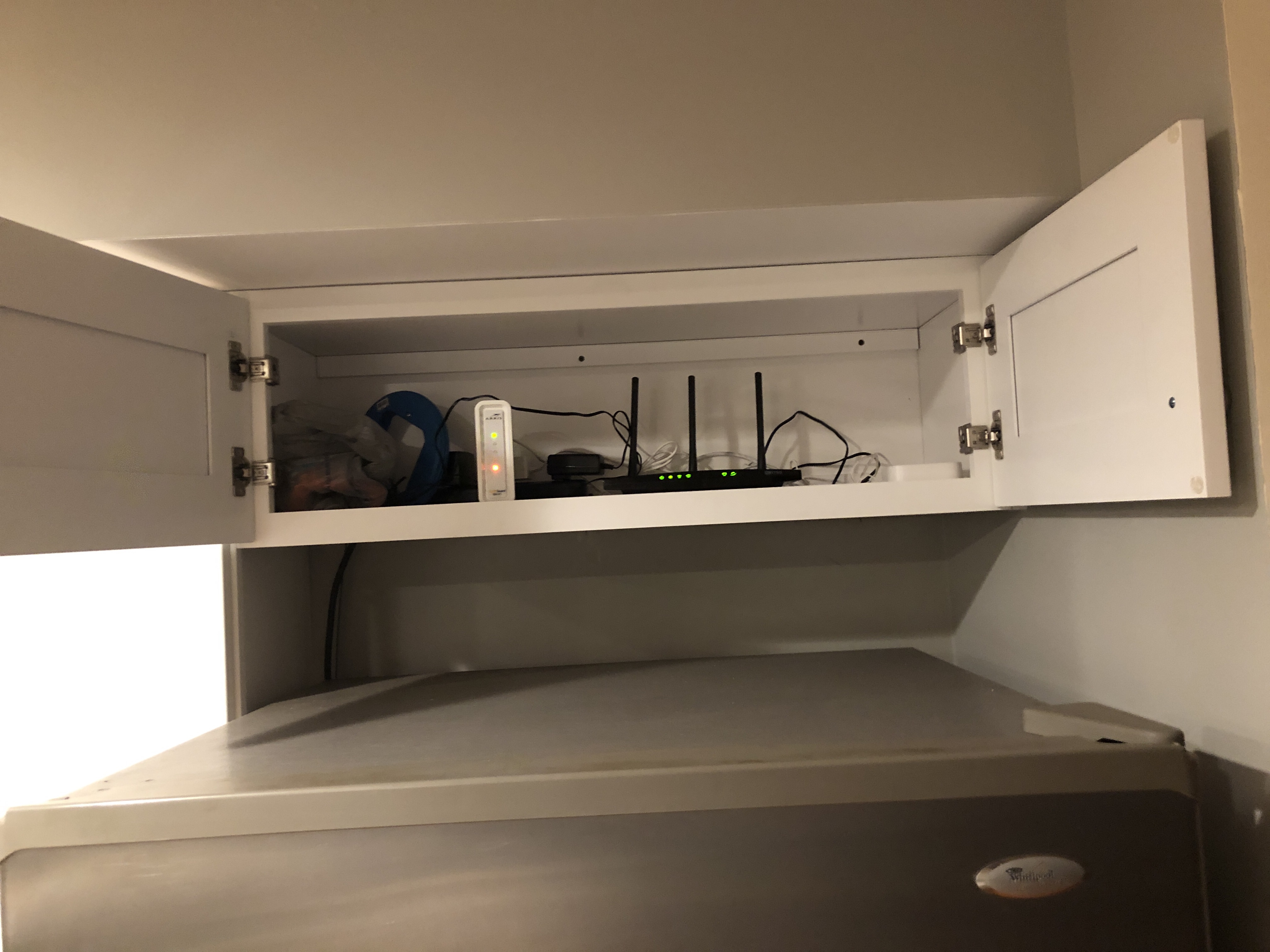 This cabinet is as close as possible to the geometric center of the building. I got solid signal throughout the first and second floors, though I imagine there will be a dead spot in the basement below the fridge.