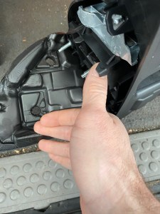 To install the mirrors, I had to remove the door skins (see door lock actuator for detailed instructions) but I couldn’t get the new mirrors to tighten flush with the door. The culprit was this little bit of plastic, it was hidden behind the foam weather seal. I removed it with a hack saw.