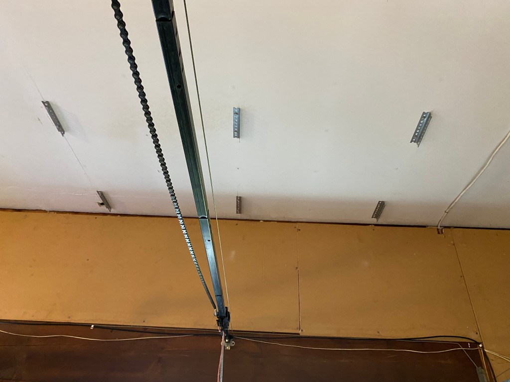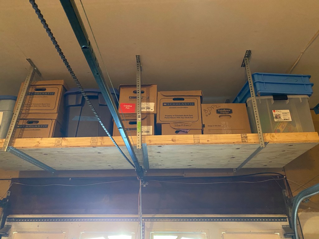 The highest point of my garage door opener hardware is twenty-seven inches from the ceiling, so I was able to hide these shelves above the garage door. I may hang some more beyond the garage door down the road.