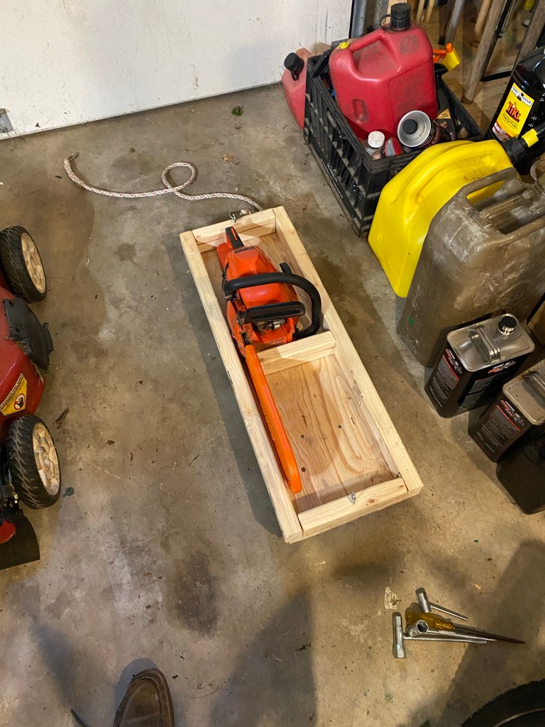 When the tree came down into our backyard last month, it took too many trips to get all the chainsaw bits to from the garage to the yard before I was able to start working. And even more, it seemed, to put everything away.