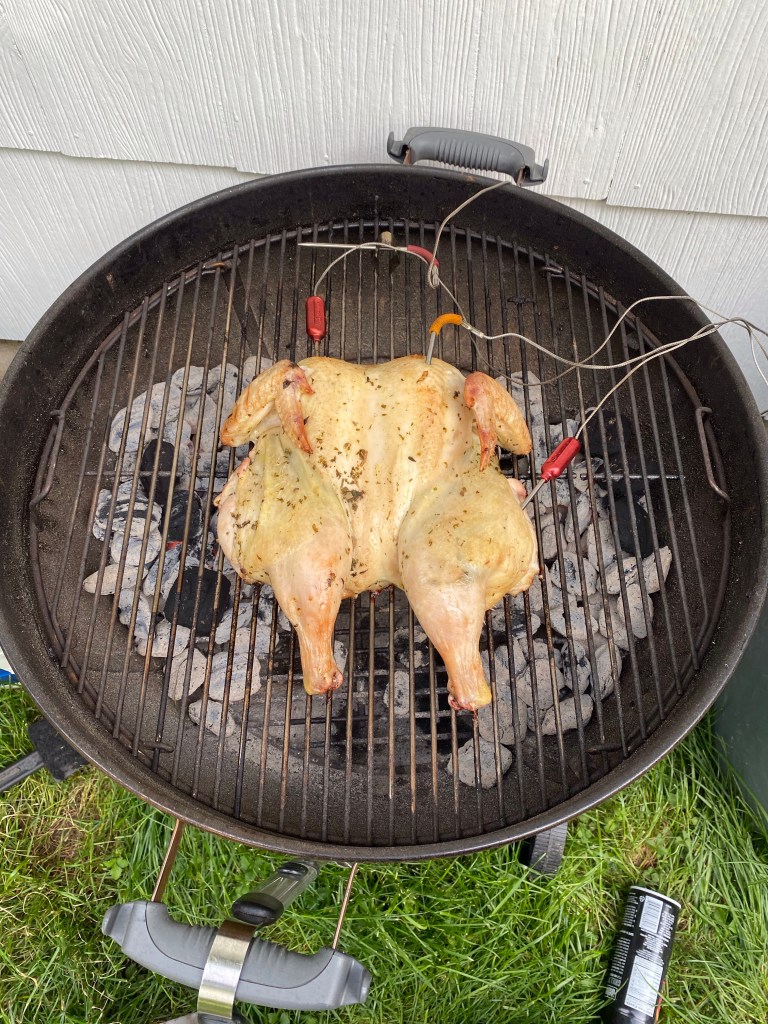 At two hours, this takes too long to cook during the week, but it is quick enough that you can do things on a Saturday and still have time to enjoy a bird roasted over charcoal.