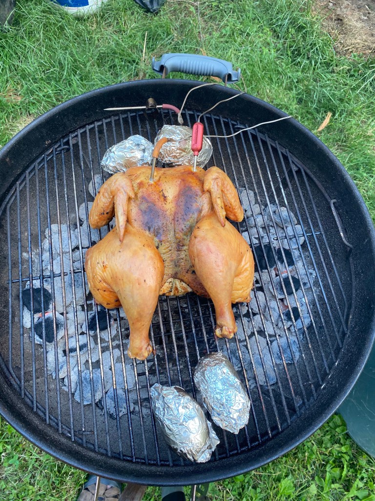 From pulling the cover off the grill to carving the chicken is just about two hours, as opposed to 12 hours smoking a pork shoulder.