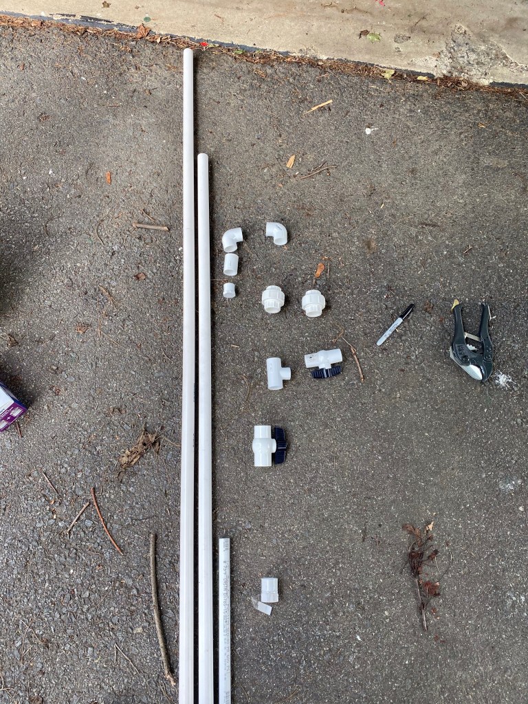 Basically, the tool is a garden hose adapter attached to a length of PVC pipe with two 90’s and a cap with some holes drilled through. I added a valve to start and stop the water flow, and another valve to drain the tool. (The last bit is adding completely unnecessary complexity)