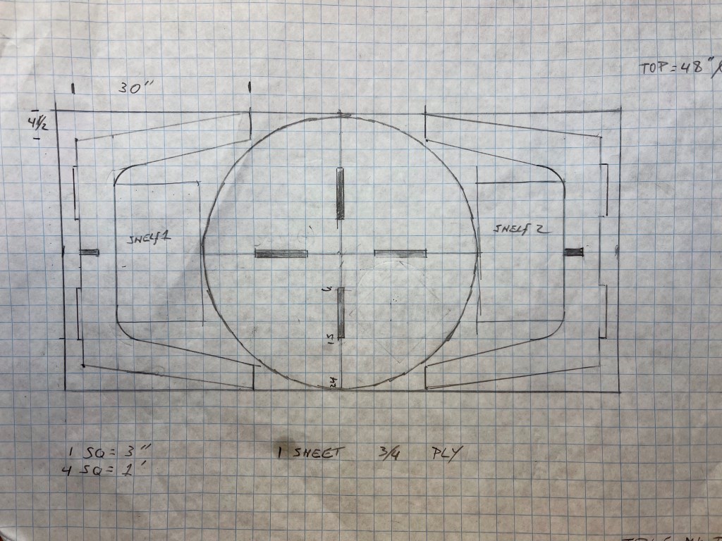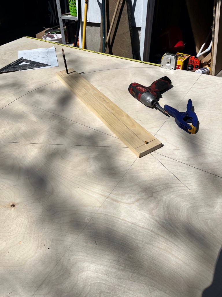 I used my table saw to cut out the round table top with this jig, if you feel the need for a side quest. If you don’t want the side quest, or don’t have a table saw, cut the circle with your jigsaw. Stay just outside the line with the jigsaw, then use a belt sander to get right up to the line.