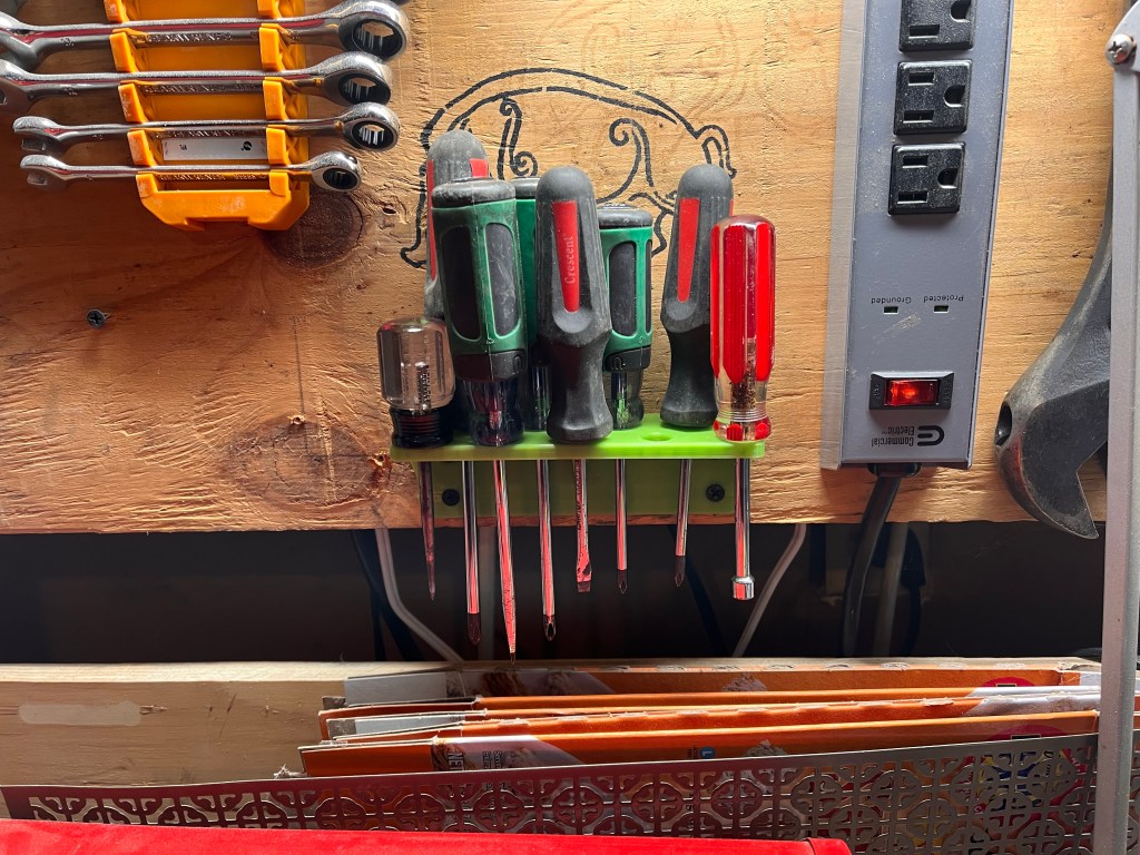 As I was printing I scrolled Thingverse on my phone and found some cool things to print. I decided my next print would be a screwdriver holder that I could screw to the back of my workbench.