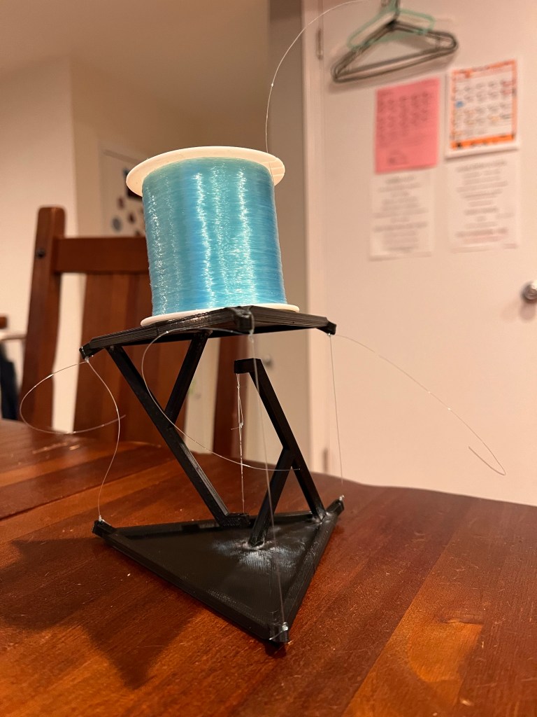 First project, chosen by my son – a tensegrity table, also known as an impossible table. It looks like the legs of the table are monofilament, while in reality, the table top hangs from the bottom. The corner lines are just stabilizers.