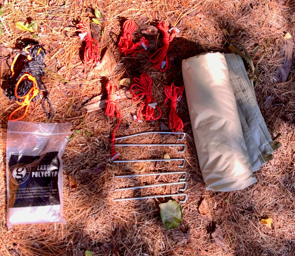 When its time to strike camp, I hank up the ridge line (video instructions here) and put it into the stuff sack with the rest of the tarp kit.