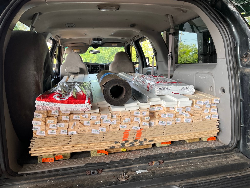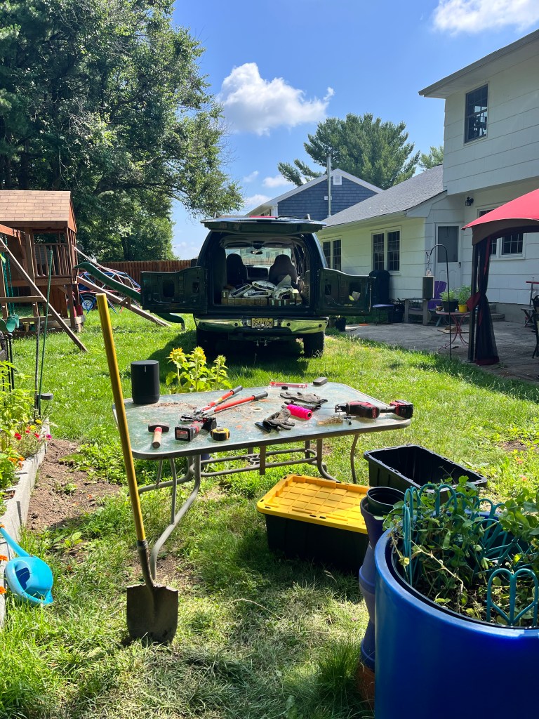 I’ve been using the Excursion as a job site trailer. All the tools and materials have been stored in the truck while I’m not actively working. But now it’s time to put everything away so the kids can use the swing set again.