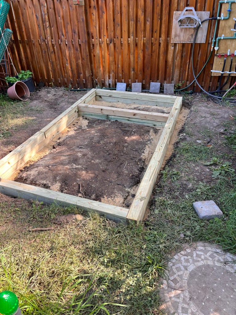 Unlike the beds, I’m framing this block with pressure treated lumber. The EPA says PT lumber shouldn’t come in contact with food, so I won’t use it where I grow food.