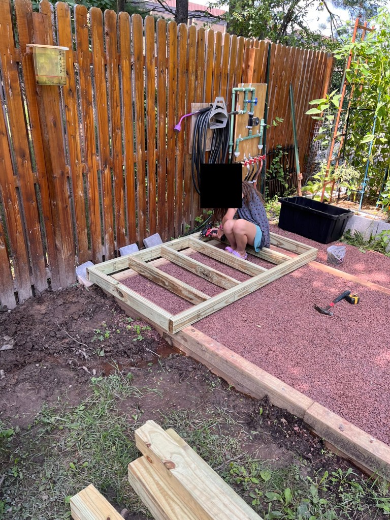 The footprint of this space matches the footprint of the raised beds. When the garden is completed, the workspace will be the back wall of the garden and the table will be just about in the center.