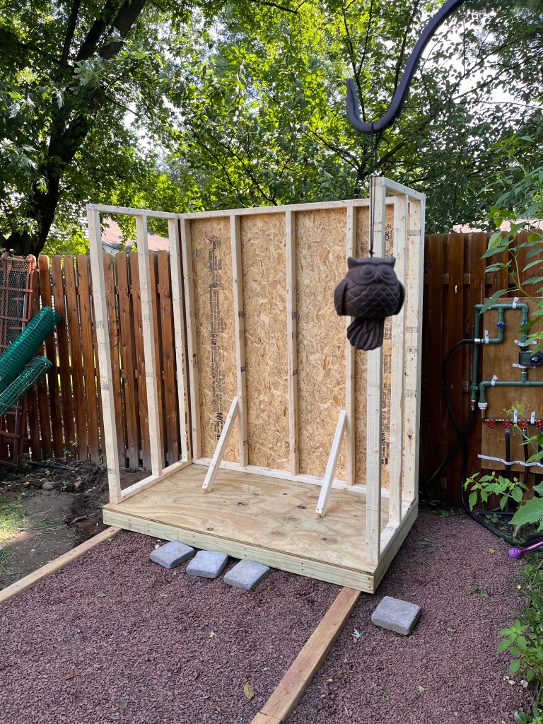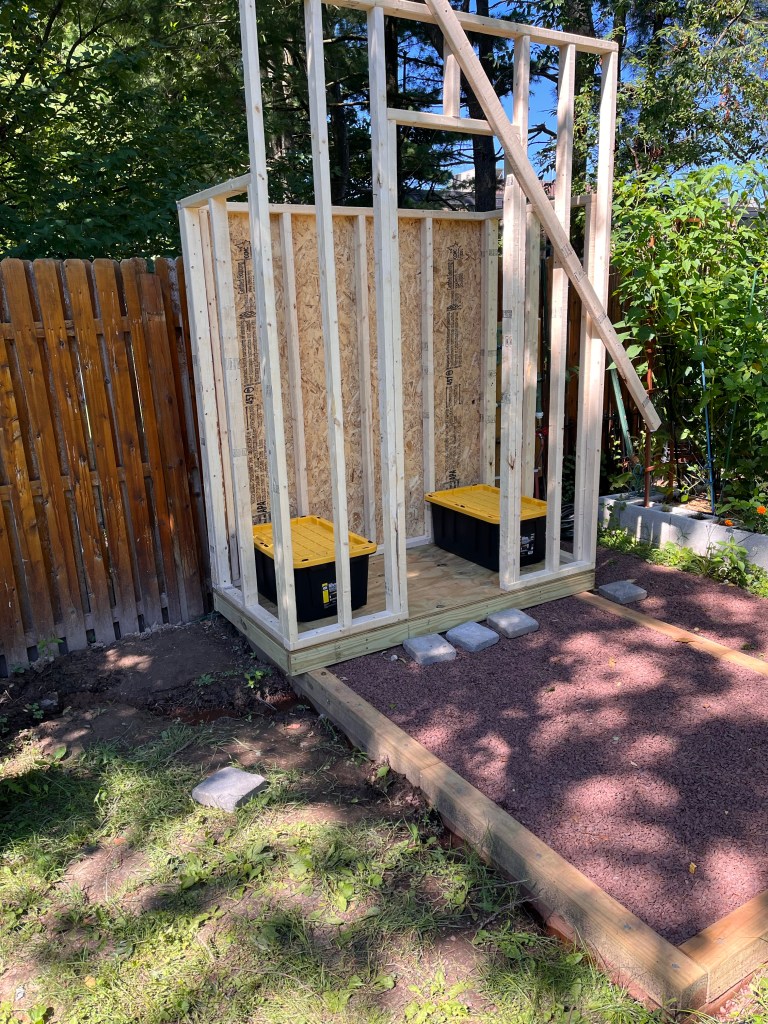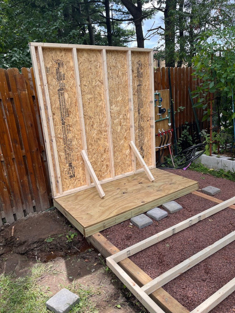 It’s obvious that I’m going to have to sheathe the back wall before it goes up. Also, the convenience hose will be moved from the fence to the side wall. And the rain gauge will be relocated or replaced.