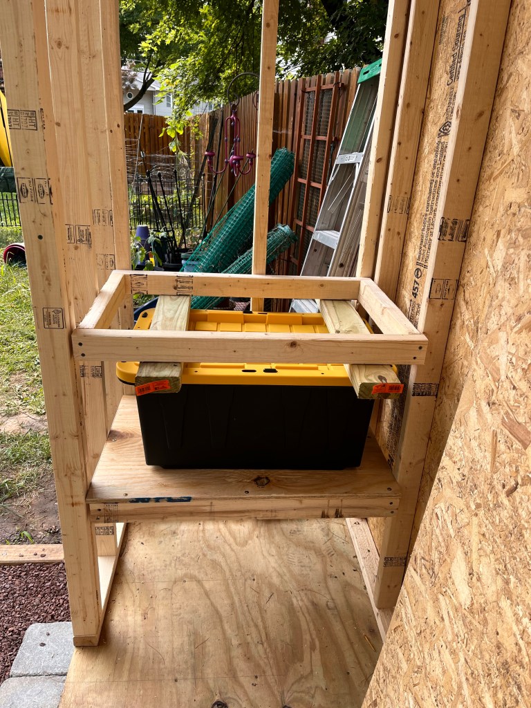 I’m not planning to sheathe the walls until after the shelves are done. It’s kind of tight in there to work.
