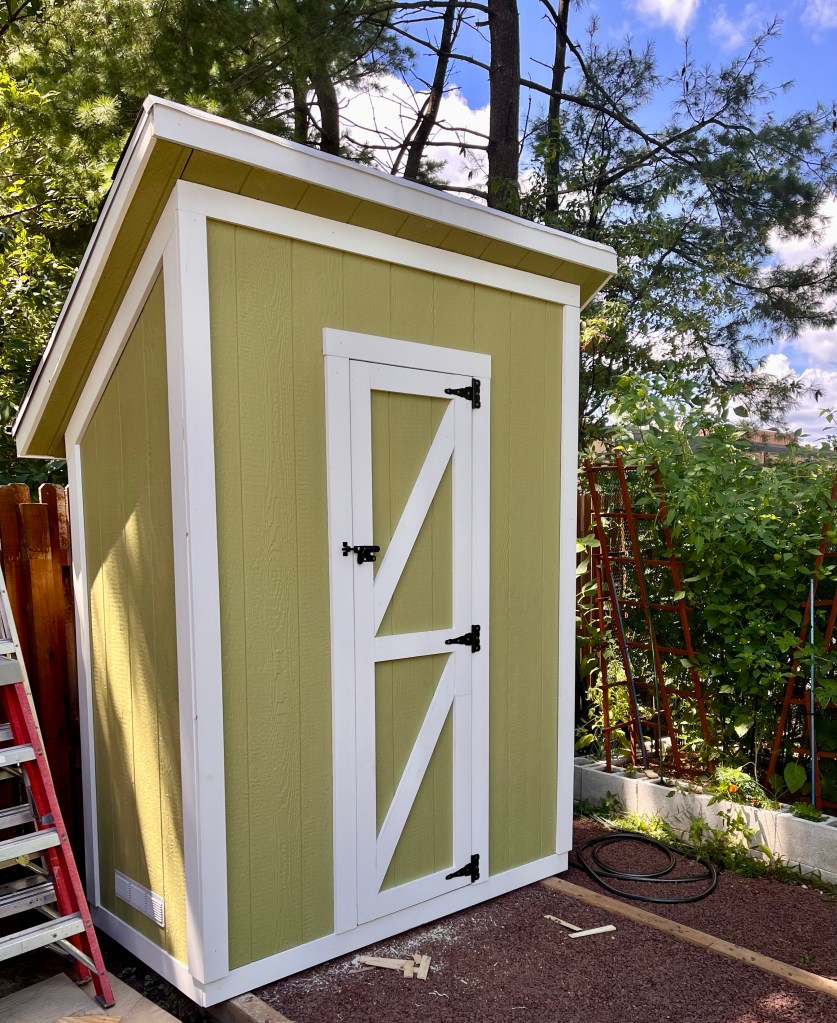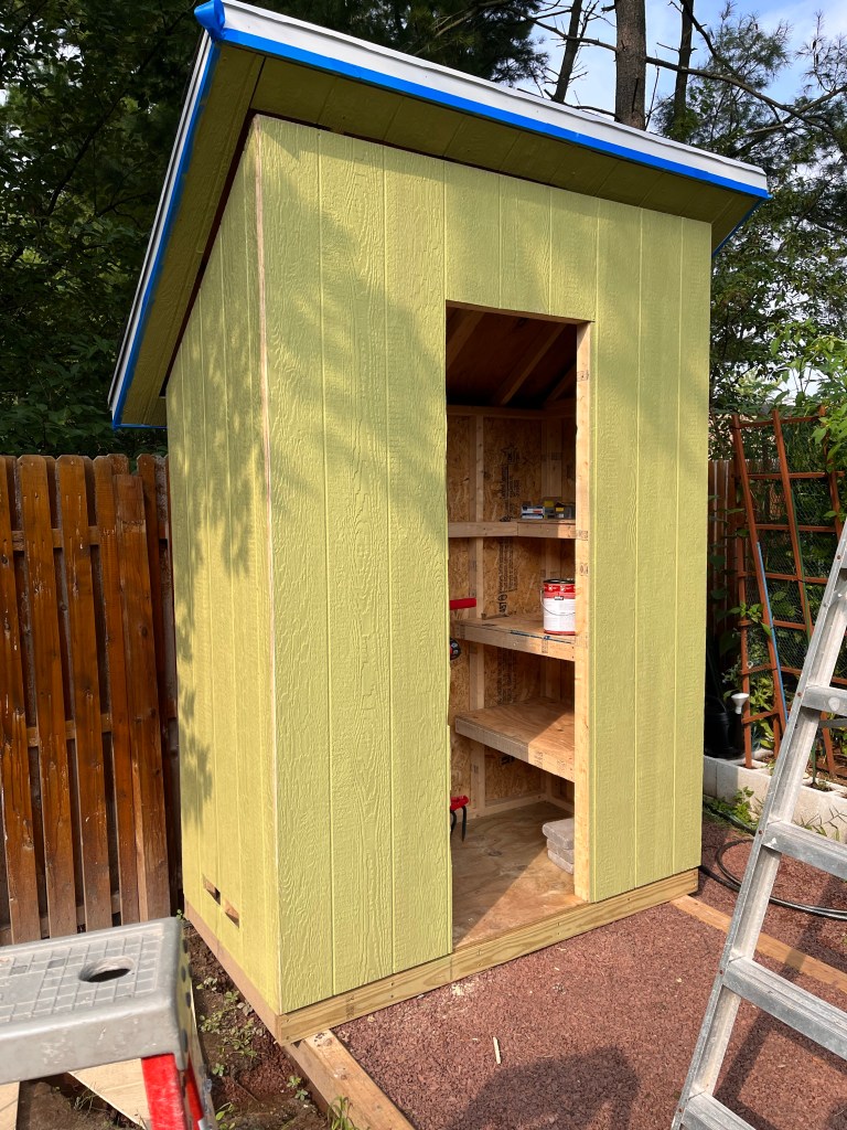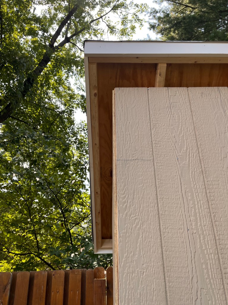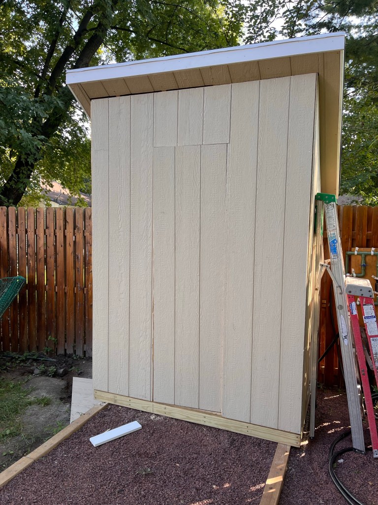 I decided to side the storage with T1-11 sheets. These sheets have a groove every 8 inches so you know where your studs are in normal construction. These grooves also help conceal your nail heads. Of course the front wall, the most visible wall, is too small for the studs to be on 16″ centers.