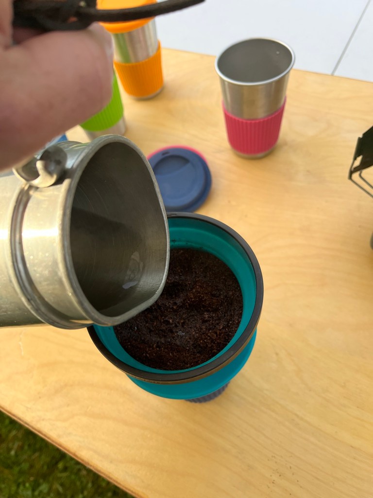 You can buy fancy pour over pots that have a long narrow spout to regulate the water flow, but when I’m camping I only have limited equipment.