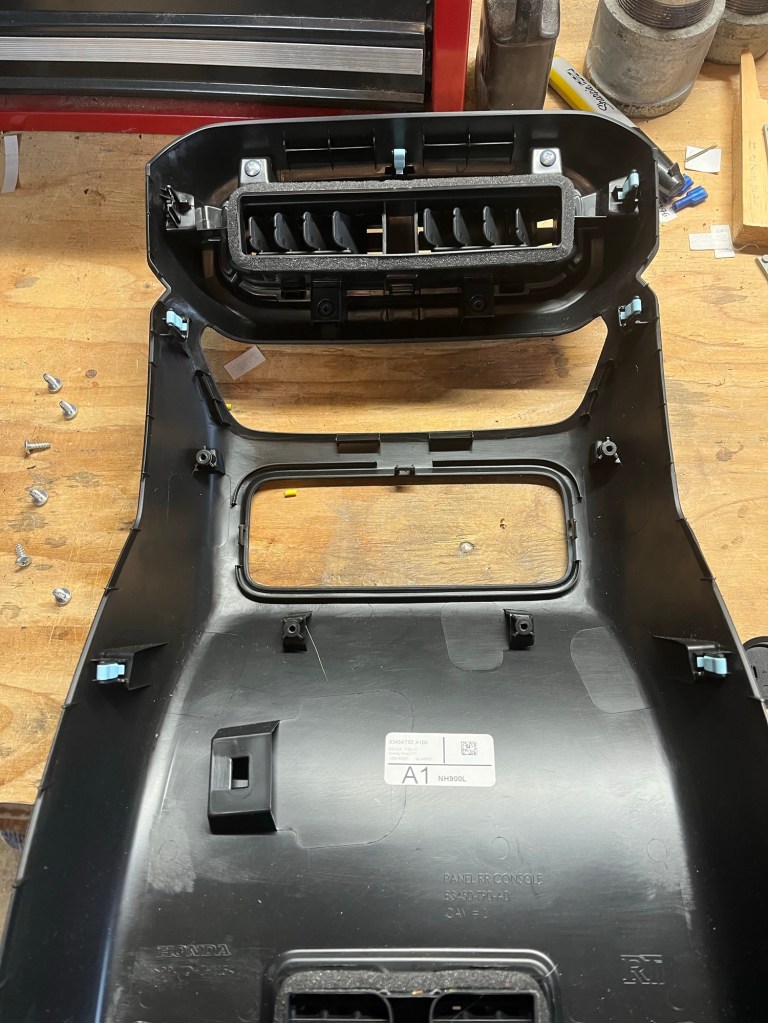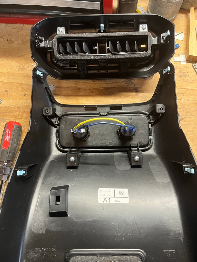 Once you get the back panel off, you need to remove the center panel (BE rear seat HVAC controls, other trims a filler panel) with a Phillips screwdriver then the lower panel, which is where our power port is going.