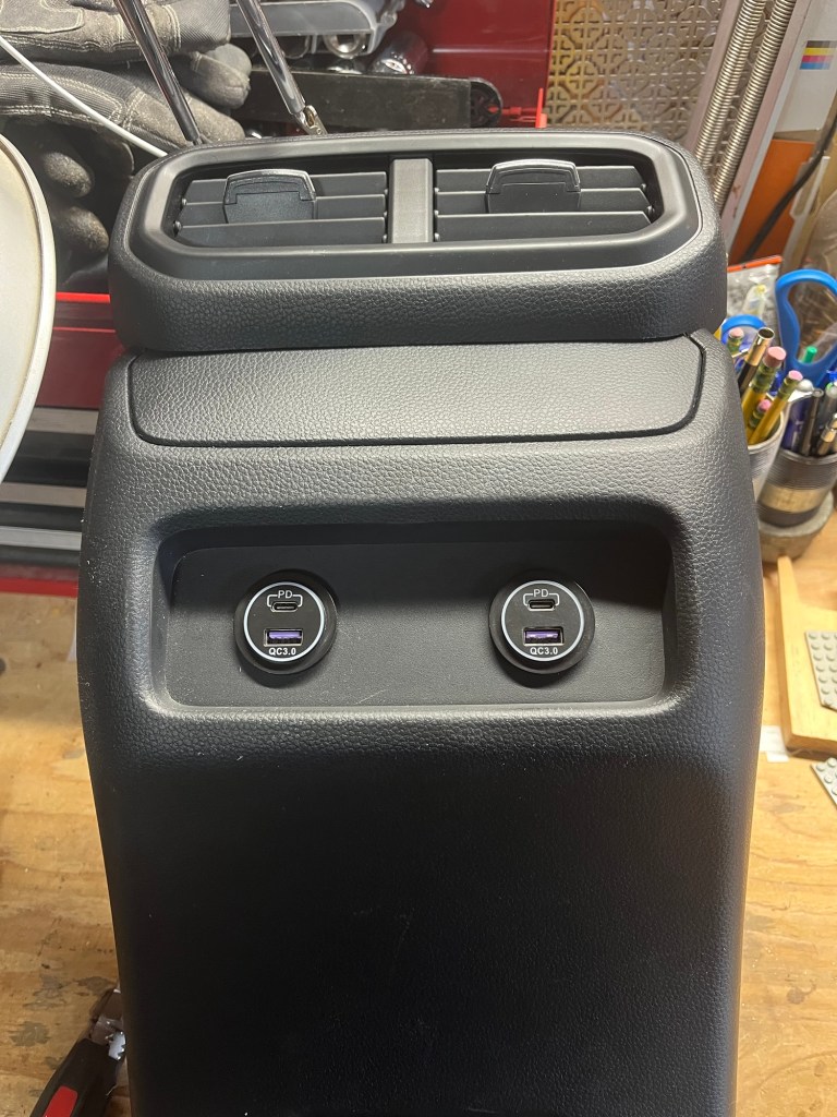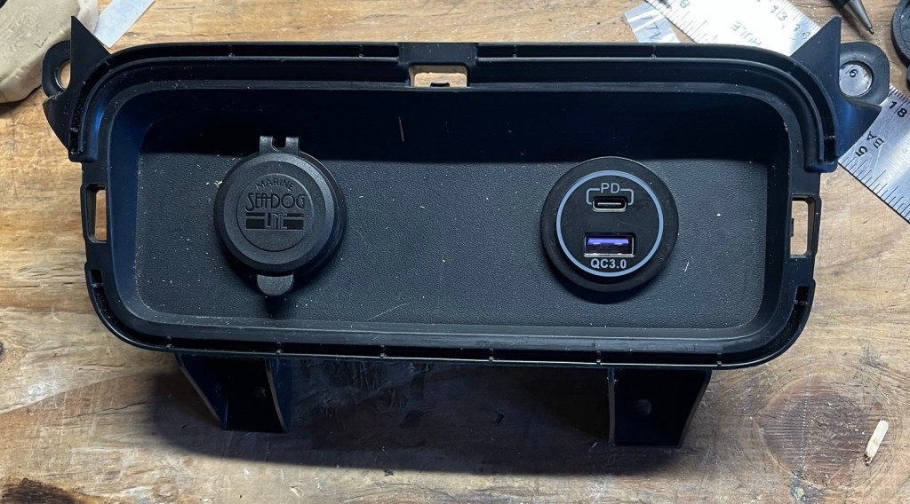 For the past two vehicles. I’ve added the trusty Blue Sea 1045 to the dashboard where Ford had installed a (useless to me) cigarette lighter. But USB-A is rapidly falling out of use, so I wanted to go with USB-C instead. I reached out to Blue Sea Systems customer support to see if they had a USB-C version in the pipeline, but they don’t. (Or at least won’t give pipeline information to random folks who send emails.)