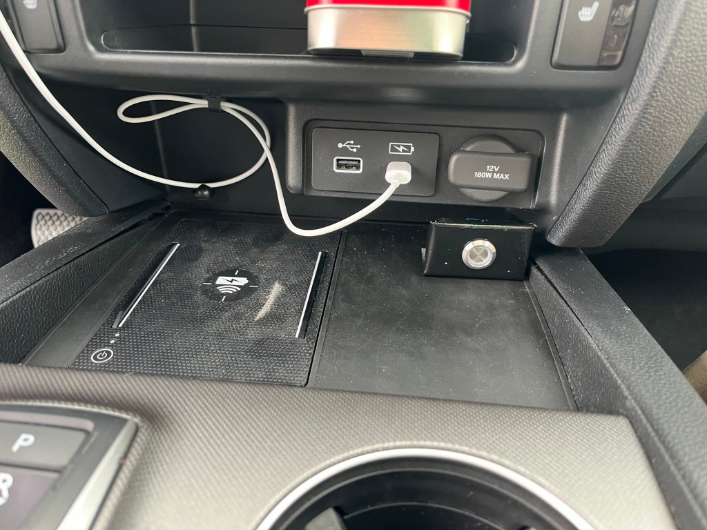 When we go camping, I like to make sure that everyone has a charged phone or watch so that I can find my family. Unfortunately, Honda doesn’t think you should have access to electrons when the engine isn’t running. Time to add some charging ports, without looking like I added some charging ports. (See Rule 2)