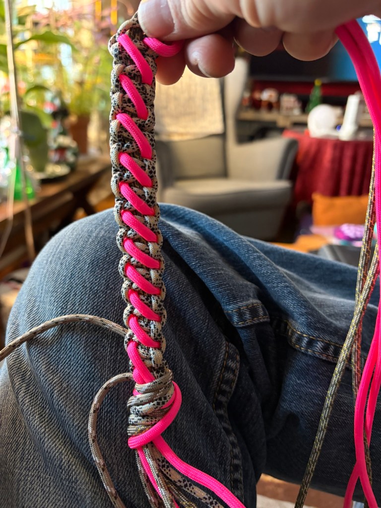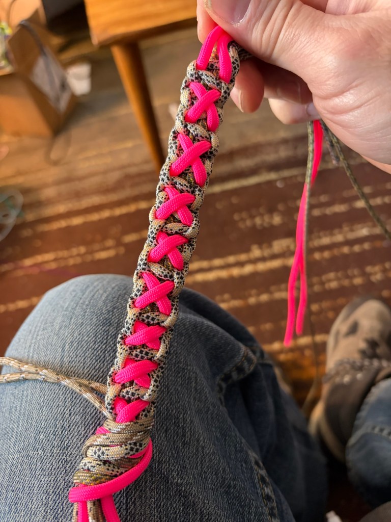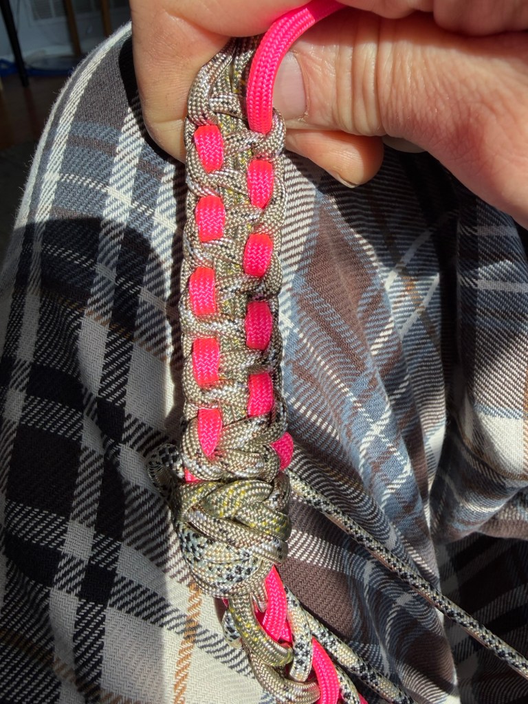 All the cool paracord kids call it the cobra stitch. Ashley calls it the Solomon Bar (ABOK 2496). In any case, it’s simple & fast to tie and makes a great sized lanyard or bracelet.