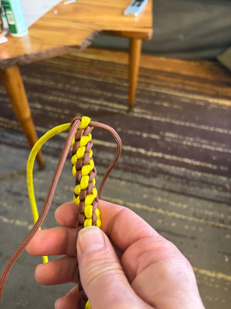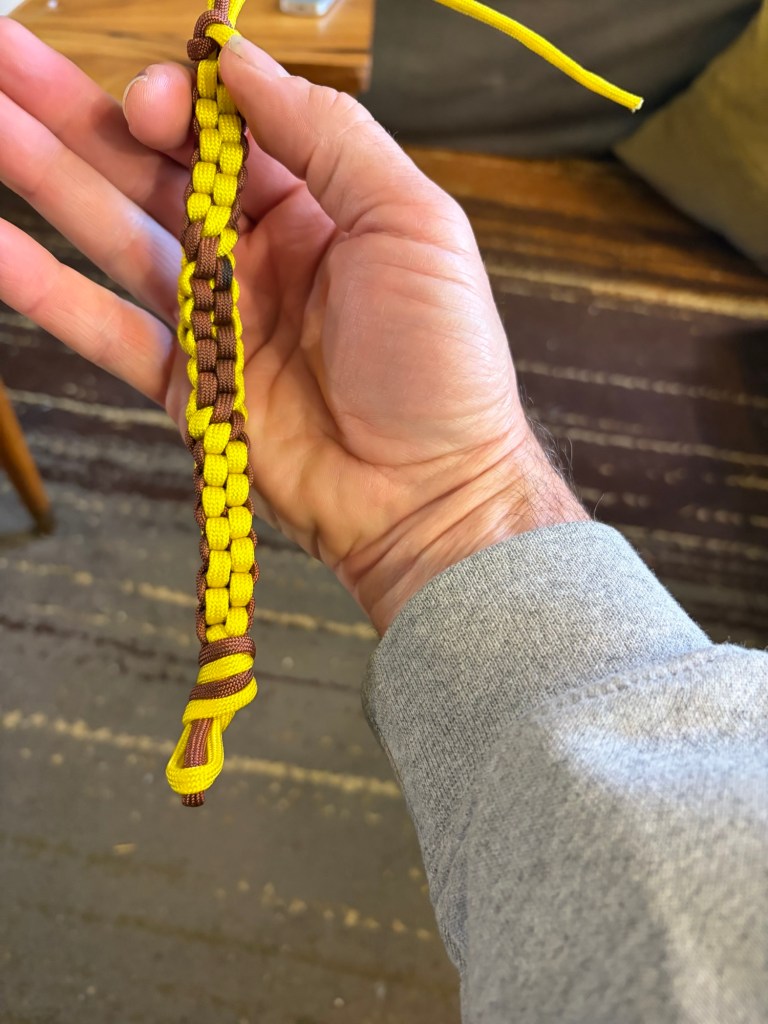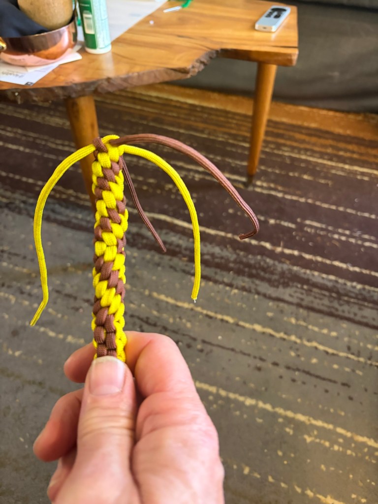 If each round layer rotates 45*, then two round stitches will rotate the project 90*. Now I can have my colors switch sides on a square handle. That being said, I’ll have to tie the square sections long enough and make enough transitions so that it looks like a purposeful pattern rather than an ugly mistake.