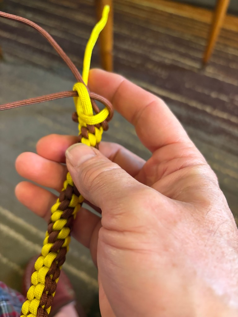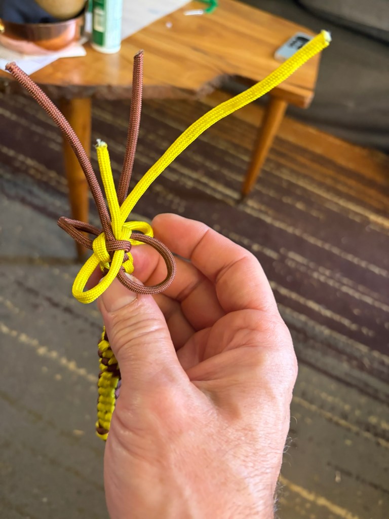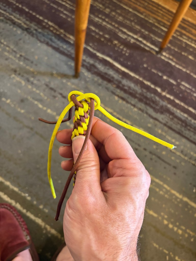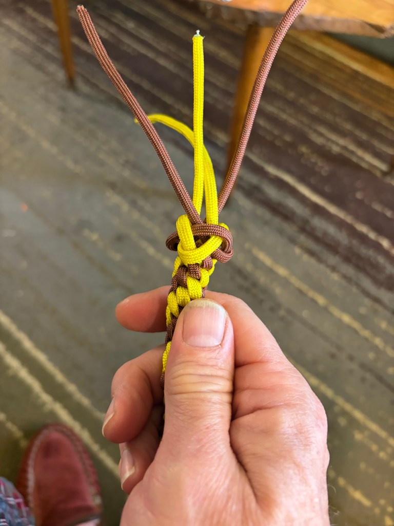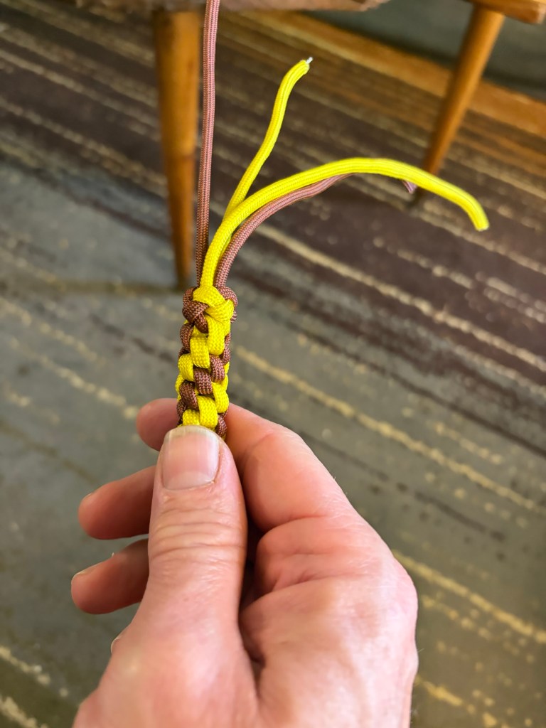 Normally, this knot is tied with four strands, two of each color. (Note – I’ve done as few as 3, as many as 8. More than 6, you’ll want a core to tie around.) It looks best with the two strands of the same color opposite each other.