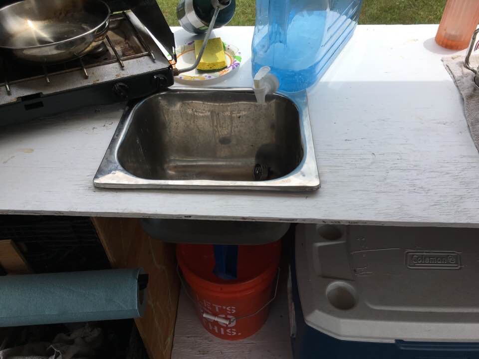 I dropped a tiny sink into the top and plumbed the drain into a five gallon pail with a lid. I have to dump the gray water about once a day. We keep the cooler in the center section under the counter.