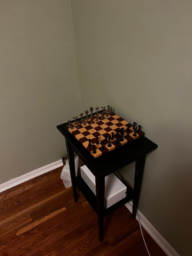 These pieces used to belong to my dad. The board was a gift from my wife. Now I have a space to leave them out, always ready for a game.