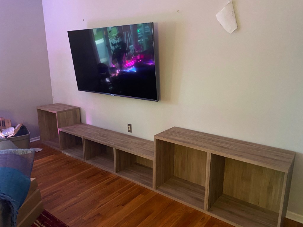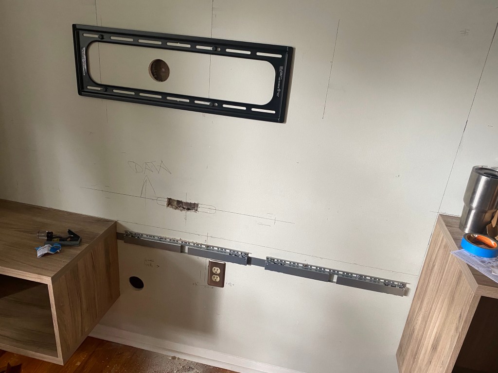 There was a pesky stud in the way, so I had to replace my HDMI cables with longer ones. Also, the original placement of the TV outlet interferes with one the brackets on the back of the TV, so I had to drill a second 3” hole behind the TV.