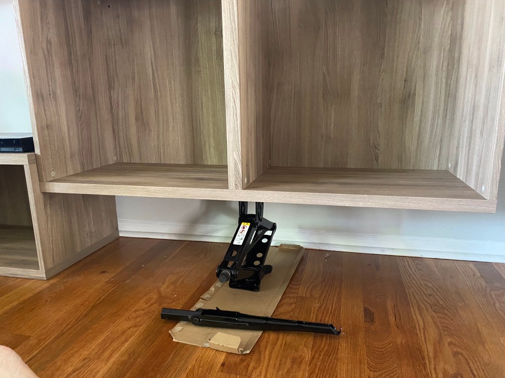 The cabinets hang on a metal cleat, but the cleat is located by holding the cabinet against the wall and scribing both top corners. I can’t hold a cabinet with one hand and trace it without moving the cabinet, so I used a the jack from the minivan.
