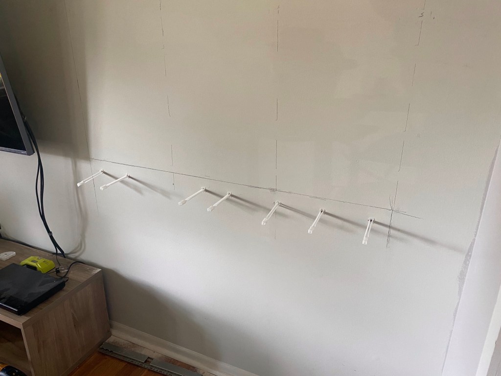 Once I had everything hung, I took all the components off the wall, leaving just the cleats and mounts. (I numbered each cabinet so I would know where to put them back) Now to fish wires.