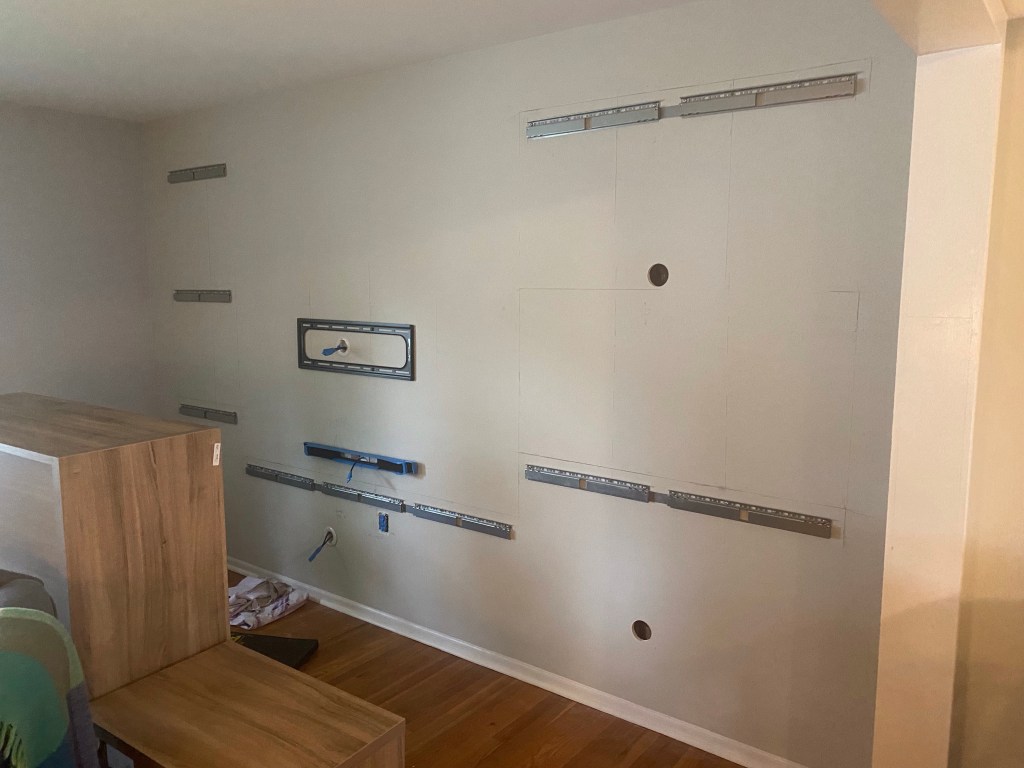The staging of this project was nutty. I have a laser level to ensure that the cabinets would be installed level and plumb, but it’s a red laser. Given that the finish wall color was going to be dark red, I wouldn’t be able to see laser or pencil marks, so I had to hang the cabinets before painting. On the plus side, hanging the cabinets first let me KNOW where I was going to be able to put holes in the wall to run wires. (Pro Tip – if you’re putting wires through the cabinet, drill through the the cabinet back while it’s mounted to ensure your holes in cabinet and sheet rock line up.)